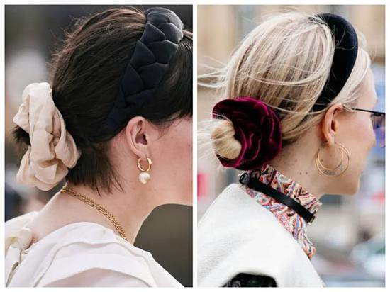 如果你是纯黑发色,建议搭配颜色深沉并且选择丝绒面料款的发圈,低调厚重又自带高级特效