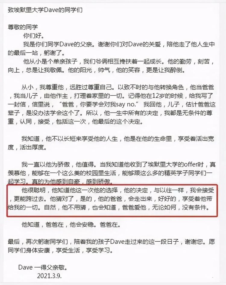 3月5日,美国埃默里大学牛津学院哲学专业一年级中国学生张一得(Dave)去世。去年秋季,因为疫情,张一得在家远程学习,今年春季开学刚到校上课,却不幸离世。在学校的公告里,写着“accident”(意外);在家长群里,大人们则小心翼翼地敲出三个字,抑郁症……