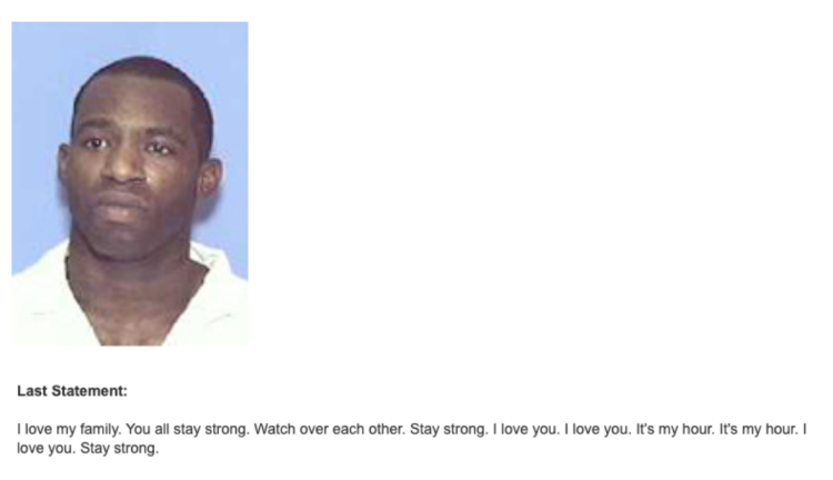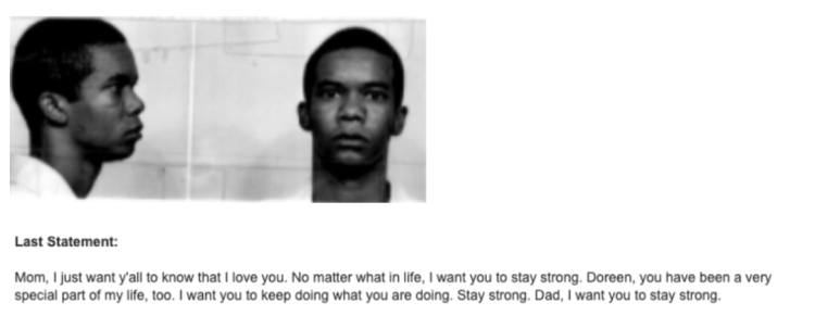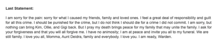 我祈祷我的死能给我的家人带来安宁让家人更紧密。我请求你们原谅我。我没有敌意;我很平静地邀请你们参加我的葬礼。我们仍然是一家人。我爱你们——妈妈,黛德拉阿姨,家人和每一个人。我爱你。我准备好了,监狱长。”
