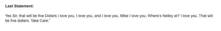 “是的,先生,这是五美元,我爱你,我爱你,我爱你。Mike,我爱你。Nelley在哪里?我爱你。总共是五美元。保重。”
