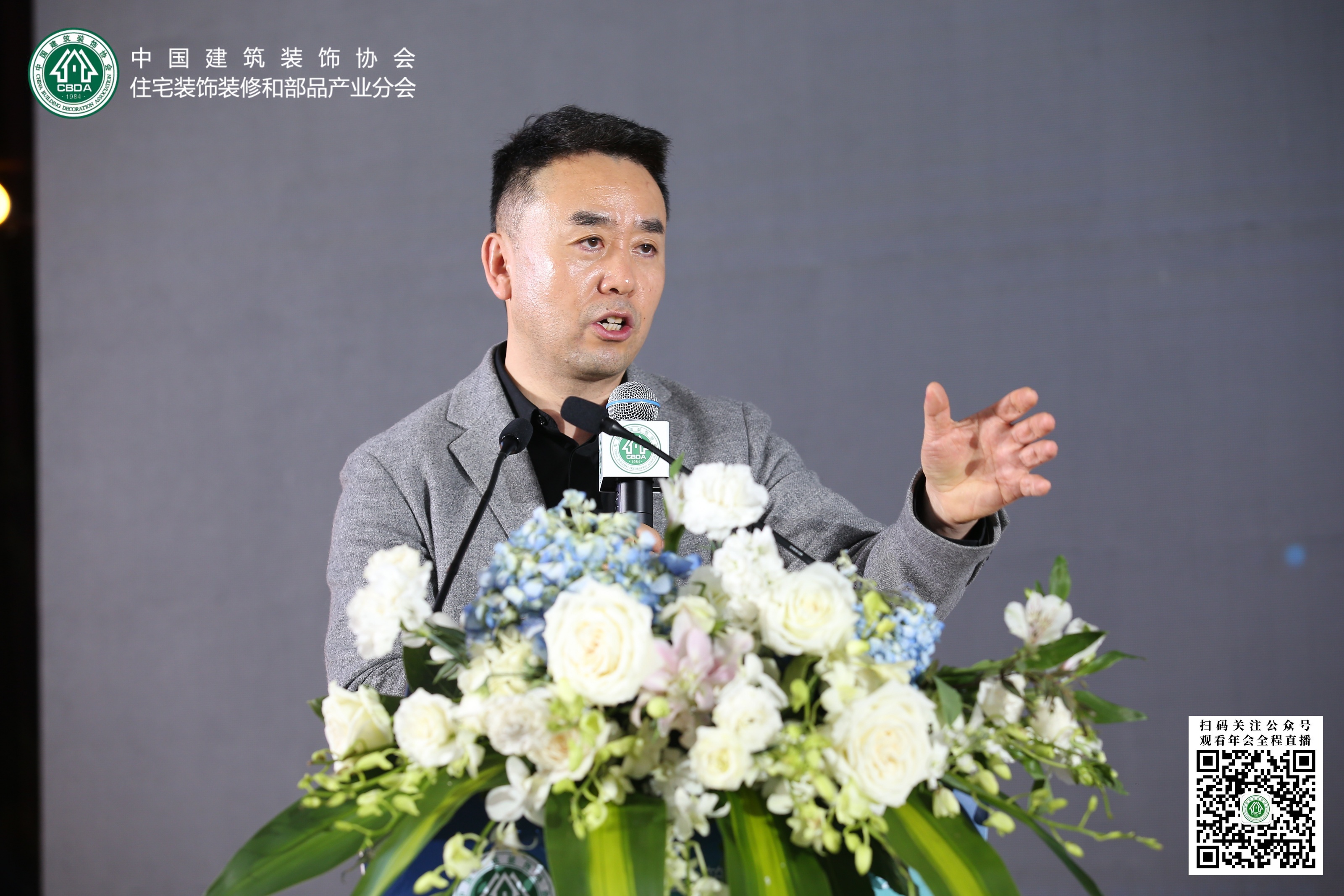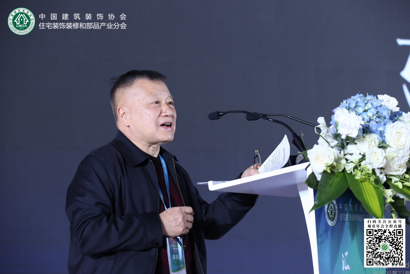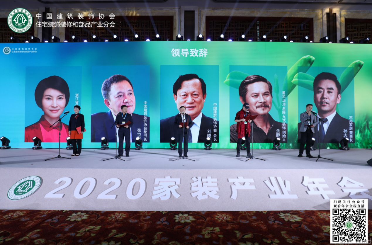 中国建筑装饰协会会长刘晓一,中国建筑装饰协会秘书长张京跃,浙江省建筑装饰行业协会会长贾华琴,中装协住宅产业分会2020年轮值会长余静赣,中装协住宅产业分会轮值会长,志邦家居股份有限公司董事长孙志勇发表联合致辞。