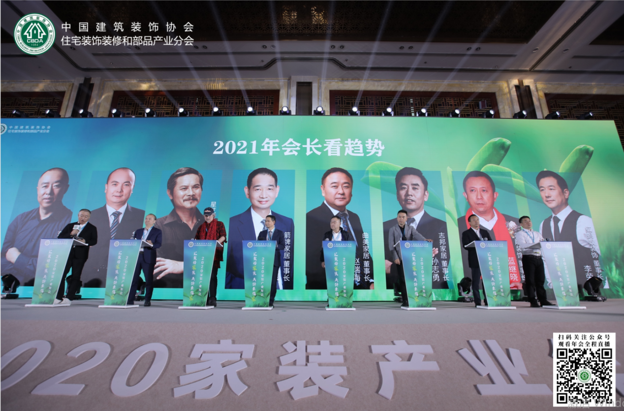 在会长看趋势环节,东易日盛家居装饰集团股份有限公司董事长陈辉,华耐家居集团董事长贾锋,星艺、华浔品味、名匠创始人余静赣,红蚂蚁装饰股份有限公司董事长李荣,箭牌家居集团董事长谢岳荣,曲美家居集团股份有限公司董事长赵瑞海,志邦家居股份有限公司董事长孙志勇,深圳市名雕装饰股份有限公司董事长蓝继晓以身处中国家装尖峰和前沿的敏锐度,洞察行业新趋势,畅谈企业转型、模式迭代、行业变迁,号召全行业一起《于危机中育先机,从变局中开新局》。