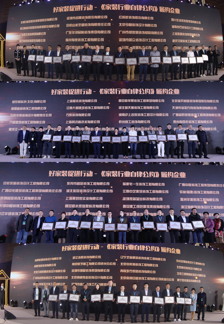 本次年会发布了78家《中国家装行业自律公约》履约企业,重庆市建筑装饰协会、合肥市建筑装饰协会、常州市建筑装饰协会、江阴市建筑装饰协会等地方协会也率领地方家装企业响应自律公约。