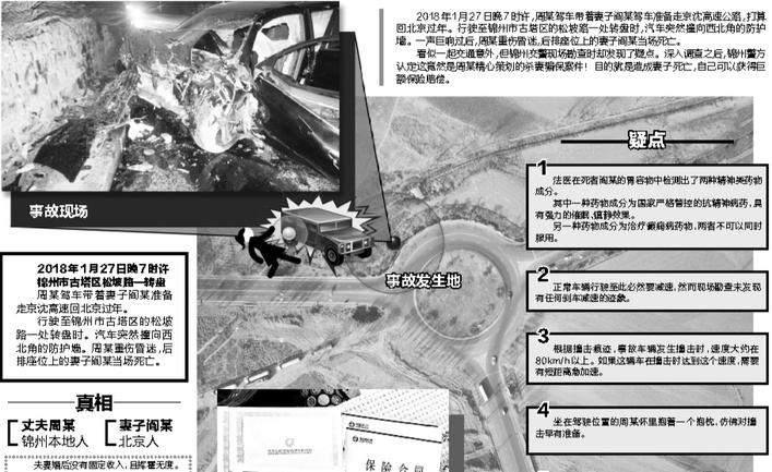 看似一起交通意外,但锦州交警现场勘查时却发现了疑点。深入调查之后,锦州警方认定这竟然是周某精心策划的杀妻骗保案件!目的就是造成妻子死亡,自己可以获得巨额保险赔偿。