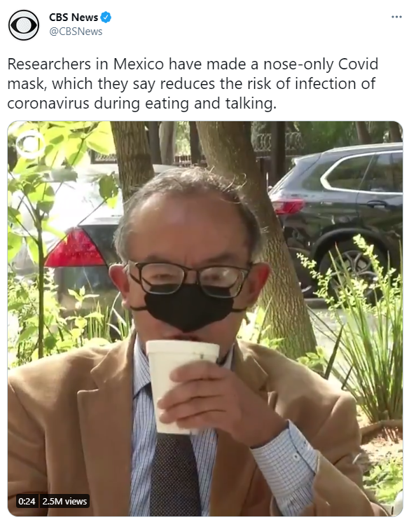 才不是!这其实是墨西哥在近日推出的一款只遮住鼻子的新型口罩。研究人员称,这种口罩是为了降低人们在吃饭时感染新冠病毒的风险。