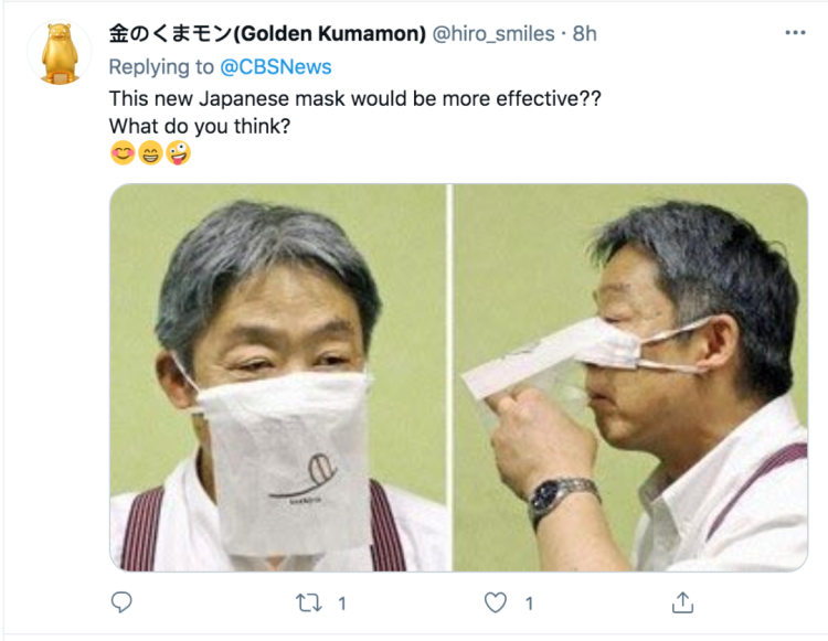 还有网友联想到此前日本发明的新式口罩,似乎更有效呢↓