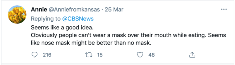 看上去不错,很明显人们不能再吃饭的时候还带着口罩,所以戴鼻罩总比没有好吧。