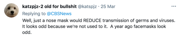 嗯,只要一个鼻罩就可以减少细菌和病毒的传播,现在这看起来很奇怪,是因为我们不习惯它,(就像)一年前,口罩也看起来很奇怪。