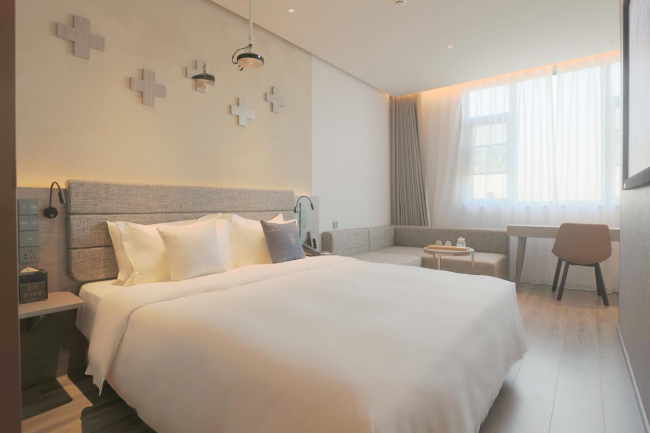 朗丽兹酒店北京亦庄桥地铁站店处在三台山路、西环北路和亦庄文化园西路的交叉口,堪称“把守”着市区连接亦庄经济开发区的通路。成功的选址创造了良好的客源条件,开业仅一个半月,亦庄店的综合出租率便突破了70%,其在携程、美团等主要OTA上的评分已达到4.9。