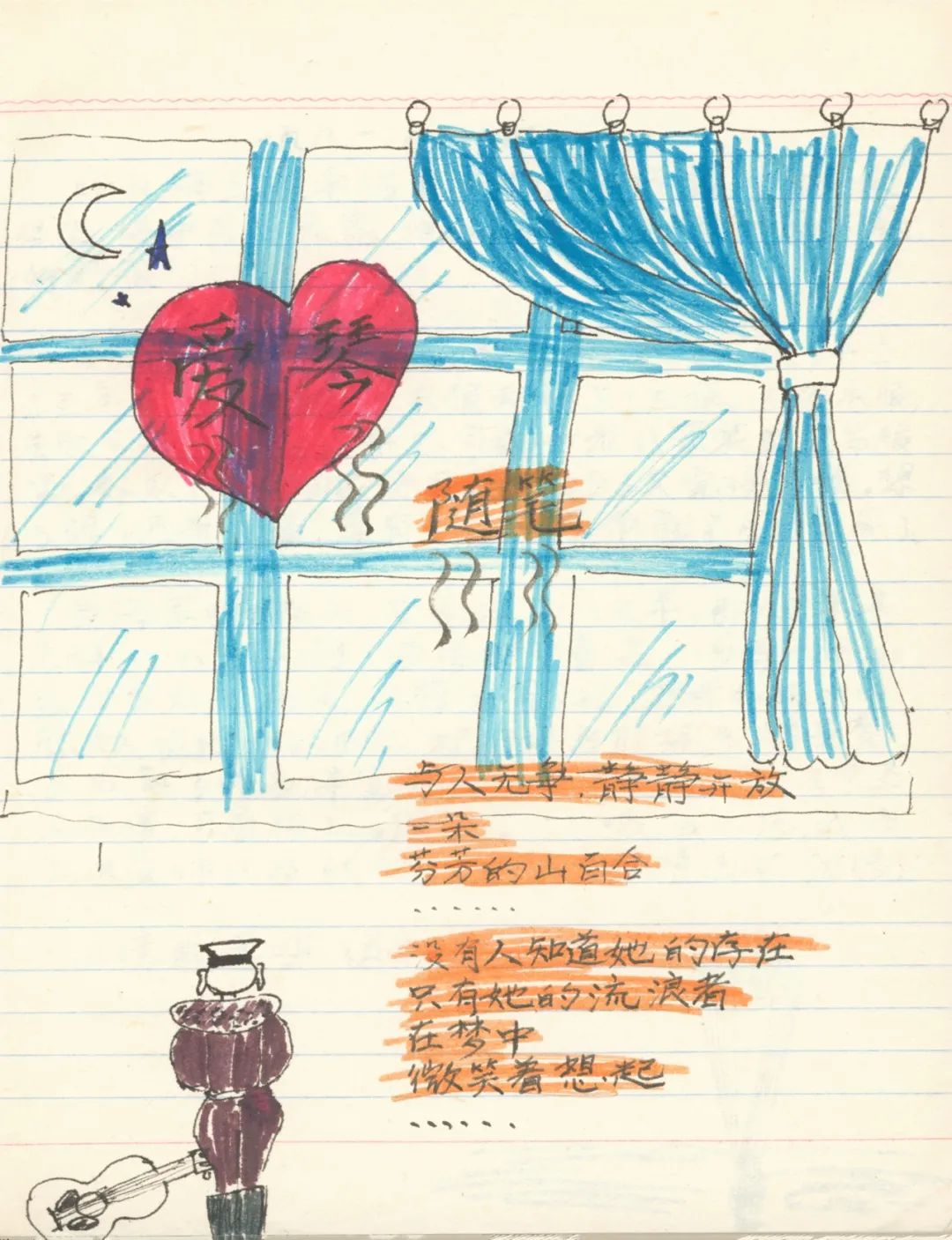 王伟把诗写进日记,画上一扇窗,窗上有颗写着“爱琴”的红心,窗前是他带着吉他仰望的背影⋯⋯