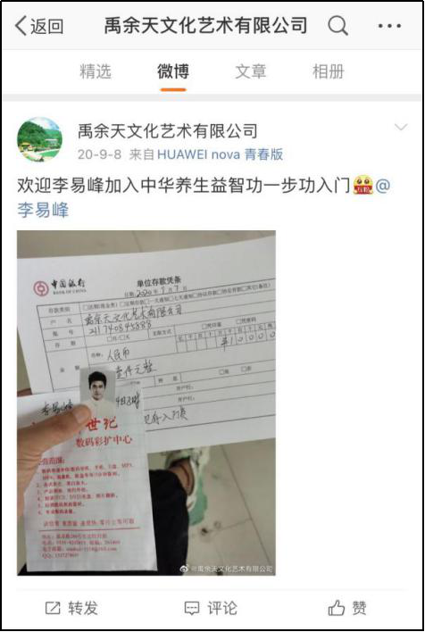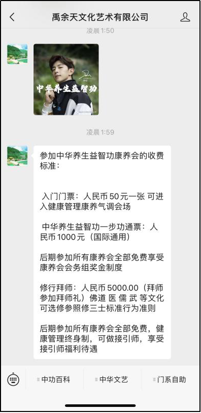 借用明星代言,谎称明星李易峰交了1000元加入“中功”