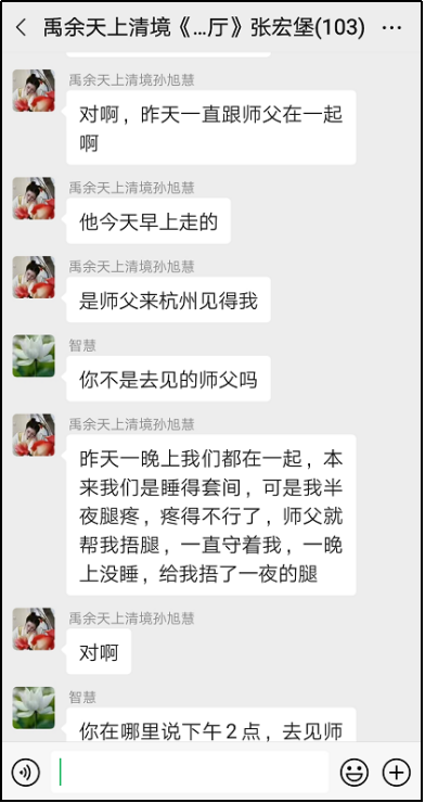 在微信群里,孙旭慧对群友们说,“我可是特医师祖张宏堡尊师培养出来的孩子”,并常常以张宏堡传人的名义传达各种所谓“师父的指令”。