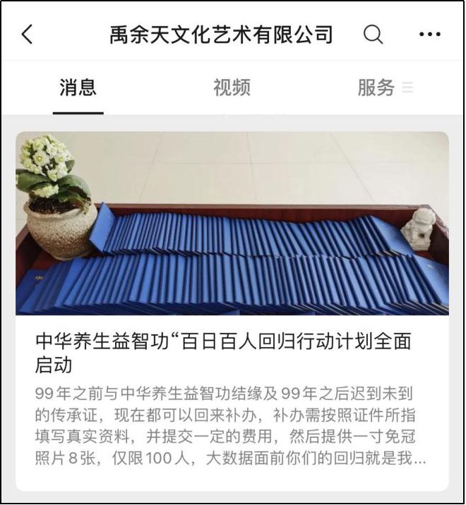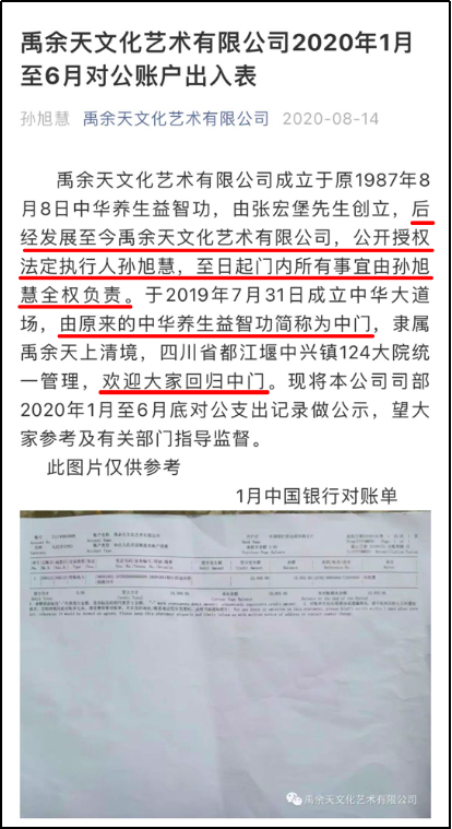 为了快速招揽信徒,孙旭慧还专门注册了与公司同名的微信公众号和微博,开始宣扬张宏堡及其“中功”邪说,并称自己是张宏堡公开授权的法定执行人,宣布门内所有事宜皆由她全权负责。