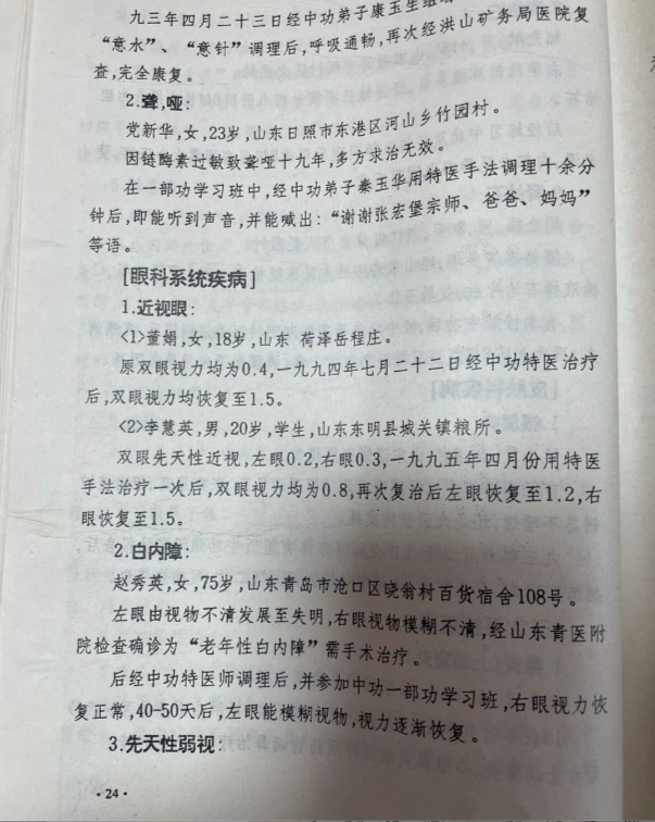 在其印制的宣传书籍中,充斥着不少如今看来匪夷所思的“医学奇迹”。如:外伤性高位截瘫患者在经“中功”特医手法治疗一疗程后四肢伸屈自如;不能讲话的全瘫患者经“中功”特医调治一次后便能开口说话,三天后再次复治不但讲话流利,而且能下床走路……