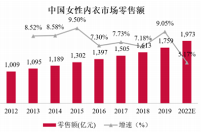 其中在贴身服饰行业中占据主导地位的女性内衣市场成长良好,根据Euromonitor 的数据,2012 年至 2019 年,中国女性内衣市场零售额的复合增长率为 8.26%,并且2022 年该市场规模预计将继续增长至 1,973 亿元。