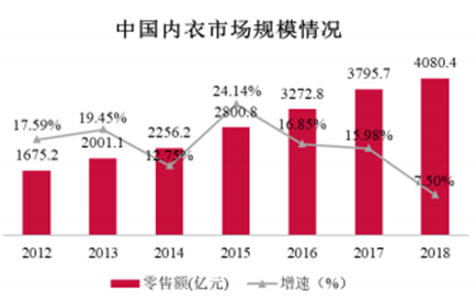 根据智研咨询的数据,我国内衣市场规模已由2012 年的1,675.2亿元增加至2018年的 4,080.4 亿元,保持了良好的增长态势。