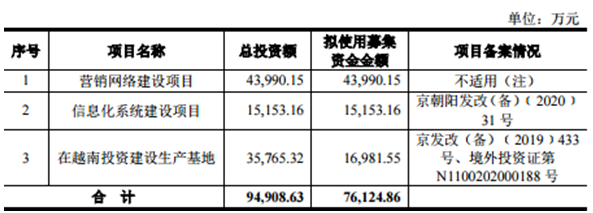 据招股意向书披露,爱慕股份本次公开发行股票的数量不超过4001万股,将募集约7.612亿元,其中4.399亿元将用于营销网络建设项目,1.515亿元将用于信息化系统建设项目,1.698亿元将用于在越南投资建设生产基地。如下图: