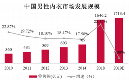 另一大类的内衣市场中国男性内衣市场,近几年表现也不错。据中国服装协会和艾媒数据中心的数据,发展规模由 2010 年的360 亿元快速增长2019 年1,713.4 亿元,具有稳定增长的下游消费需求支撑,预计到2022年中国男性内衣市场将突破2000亿元。