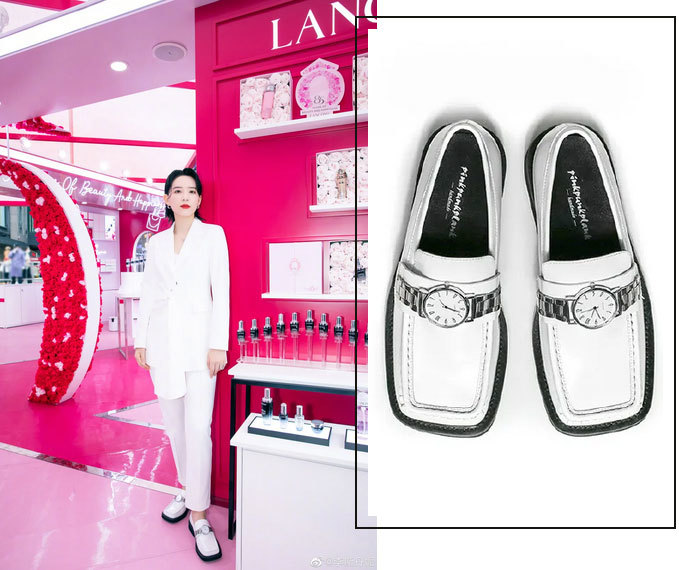 李斯丹妮这双方头小皮鞋竟然被她穿出了憨憨可爱的高级帅气质,这双鞋鞋面上还有两块真正走时的石英表盘,设计富有巧思。