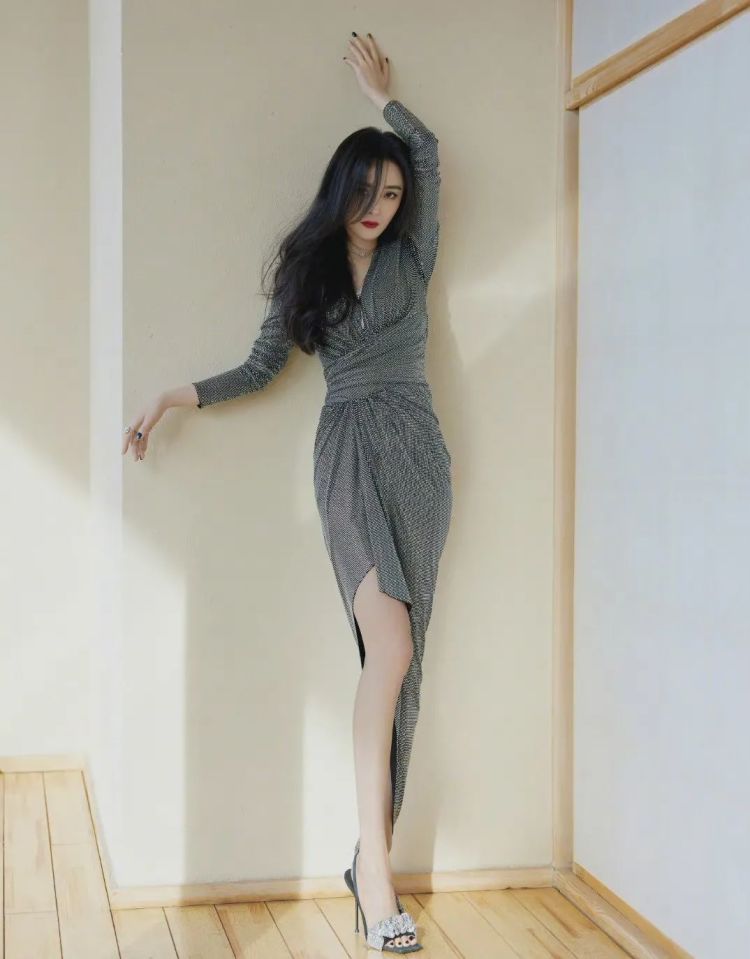 这双钻扣方头细高跟凉鞋也绝美!银色修身长款低领紧身裙的加入更多了一份妩媚动人。