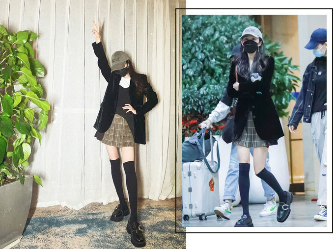至于行走的种草机大幂幂那更不用多说,就没有她赶不上的趟!前几天走机场穿的就是方头皮鞋,再搭配上黑色西装和格纹半裙,甜酷学院风。当天杨幂穿着这组look还发了不定期随手记,有被美到。