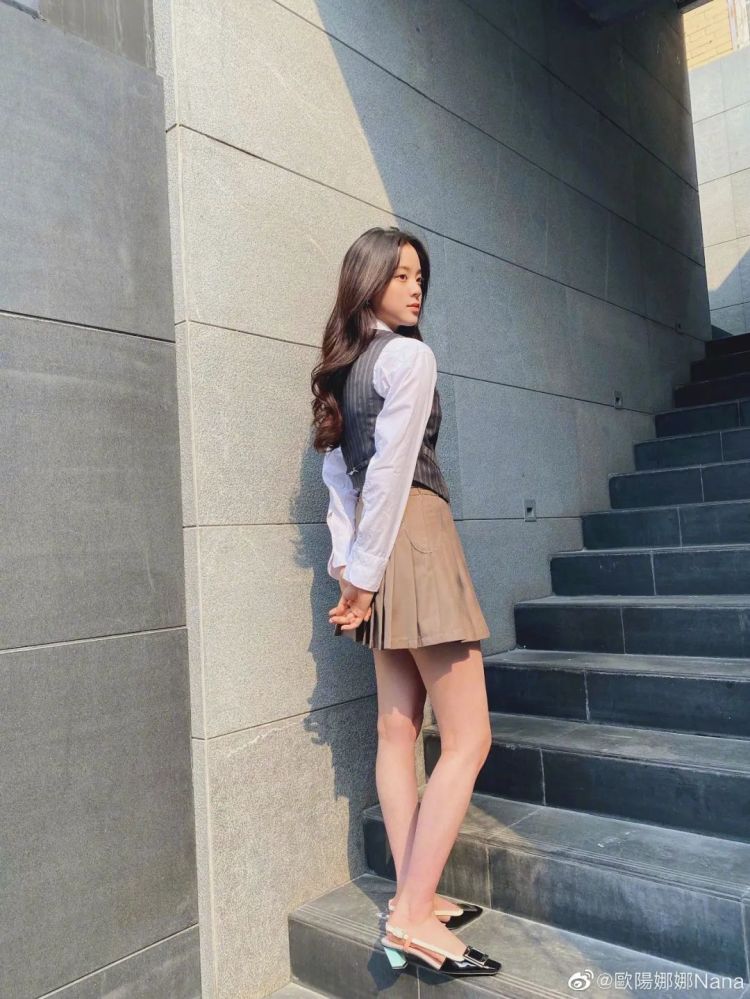 欧阳娜娜用JK制服搭配Roger Vivier方头凉鞋,一下子就有青春校园剧的味道了,甜酷表现力可圈可点。一人血书求娜比考虑再演一次校园剧吧!