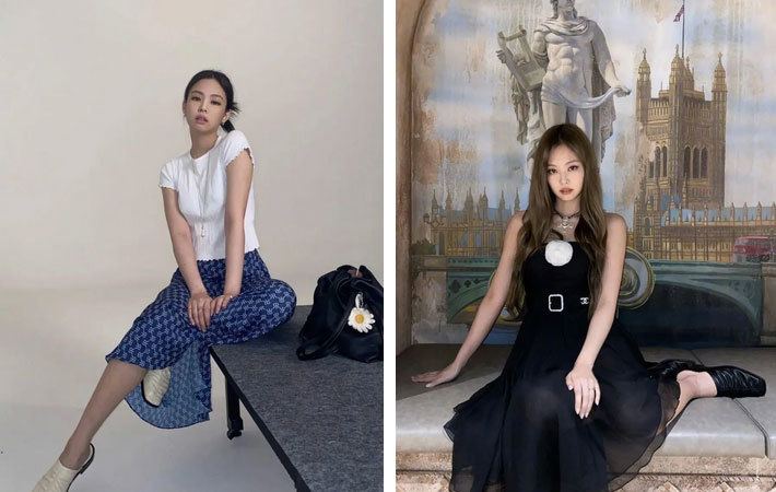 本季的方头鞋在面料上铆足劲大面积使用,虽说不能完全等同于成熟,却可约等于A。Jennie的鞋柜里方头鞋的比例应该占了不少,自带复古属性,随意又休闲,而且百搭。