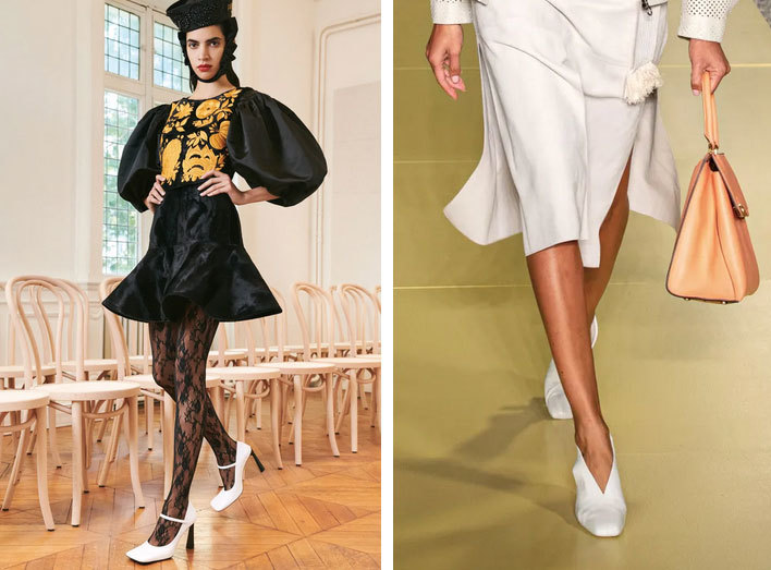 常见的方头玛丽珍我们暂且按住不表,表一表70多年来一直是以圆头为标签的芭蕾舞鞋愣是被方头掰出棱角这事。今年我们熟悉的芭蕾舞鞋不只是鞋头部分从圆形拓展成方形,前脸也被拉长了。