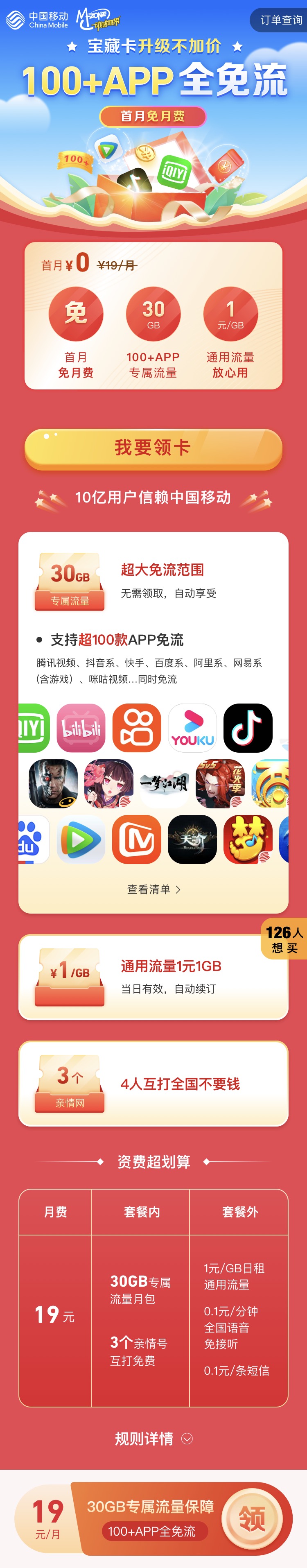这款中国移动动感地带花卡宝藏版在资费方面对学生党们十分友好,月费仅需19元,首月还能免月费。每月30GB专属流量,可覆盖超过100款APP!最让二次元玩家欲罢不能的是,大家常用的APP几乎都在免流行列。