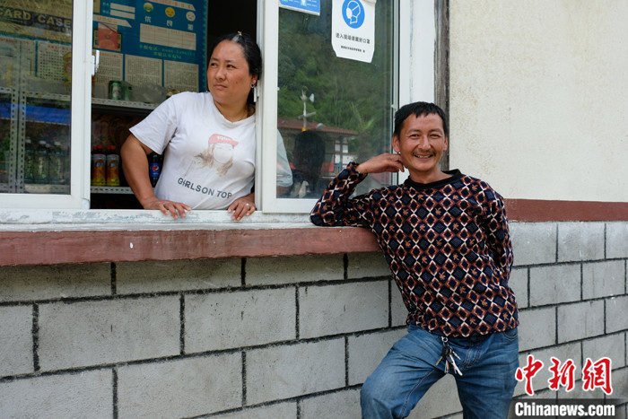 图为5月16日,西藏墨脱县墨脱镇门巴族民众扎巴和妻子梅朵曲珍在自家小商店门口,通公路前扎巴是一位背夫。 中新社记者 江飞波 摄