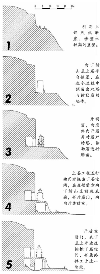 云冈窟群中的大窟开凿用时一般在6至8年,多者可达9年以上;中型洞窟开凿一般用时在3至5年;小型石窟则多利用大型洞窟的斩山崖面或修整自然断崖开凿,一两年内即可完成。