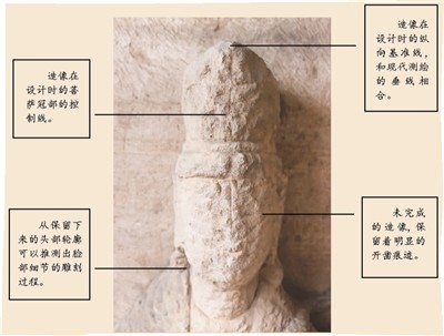 云冈石窟保留了一些未完成的造像。现在,研究者从这些未完成的造像中推断云冈造像的开凿工序、洞窟的开凿次序,进而深入讨论云冈主要洞窟与当时社会背景之间的联系。这对于题记保存较少的云冈石窟来说,是一个全新的研究角度。