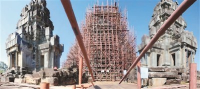 茶胶寺位于柬埔寨吴哥城胜利门外,是阇耶跋摩五世国王为自己建筑的国寺。现存遗址占地面积约4.6万平方米,主体建筑占地面积超1.3万平方米。茶胶寺建于10世纪末11世纪初,可能坐落于一组规模庞大建筑组群的中心位置。茶胶寺保护修复项目包括建筑本体保护修复、石刻保护、展示中心建设和环境整治。其中建筑本体修复涵盖26个修复点。图为中国援外考古队正在修复其中的庙山五塔。