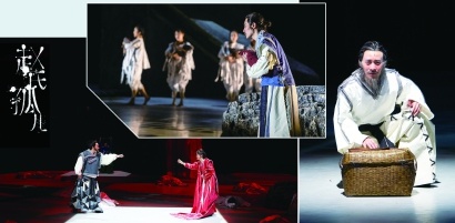 苍凉的城墙在舞台上斜立,一个孤独幼小的灵魂悄然立于石阶,他的吟唱,召唤出古老的“复仇”故事。程婴、屠岸贾、程勃、公孙杵臼、公主等一众人物定格于画框之中,缓缓“移”向舞台,再次走入历史的风沙……