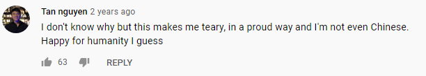 YouTube网友Tan nguyen评论中流露激动:“我不知道为什么,这个视频让我流泪,以一种自豪的方式。我甚至不是中国人。我想我是在为人类成就感到高兴。”
