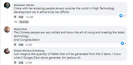 外国网友对白鹤滩水电站不吝赞美之词。Facebook网友阿布巴卡尔·雅库布(Abubakar Yakubu)在白鹤滩水电站视频下方留言:“中国人民太棒了,在高科技发展方面总是让世界感到惊讶,我们非洲人喜欢这个国家的努力。”