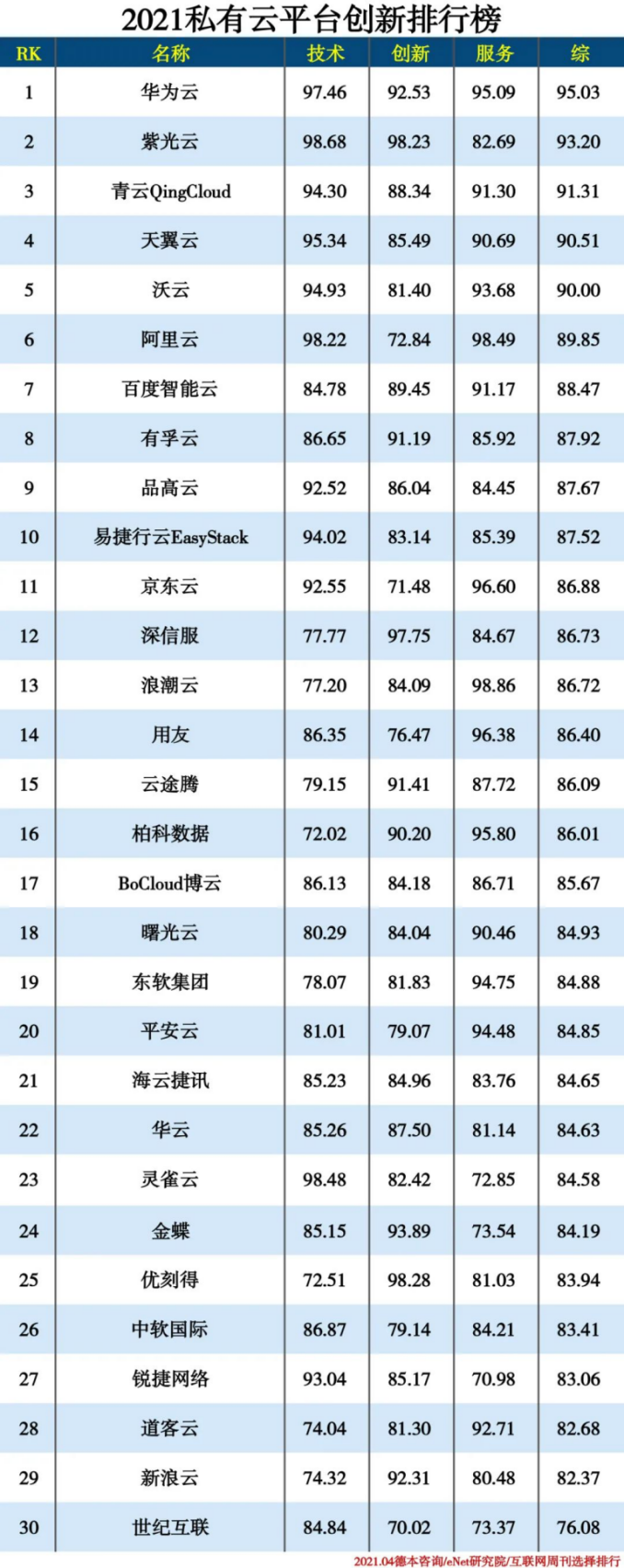 德本咨询联合eNet研究院、中国科学院《互联网周刊》联合发布了《2021私有云平台创新排行榜》,30家私有云厂商上榜。和去年榜单相比,此次霸占榜单前三的是华为、紫光云、青云QingCloud,值得注意的是,柏科数据、曙光云等新鲜力量出现在榜单上。