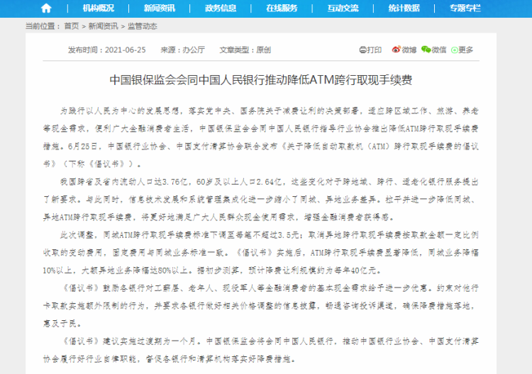 为践行以人民为中心的发展思想,落实党中央、国务院关于减费让利的决策部署,适应跨区域工作、旅游、养老等现金需求,便利广大金融消费者生活,中国银保监会会同中国人民银行指导行业协会推出降低ATM跨行取现手续费措施。6月25日,中国银行业协会、中国支付清算协会联合发布《关于降低自动取款机(ATM)跨行取现手续费的倡议书》(下称《倡议书》)。