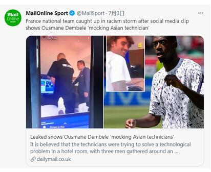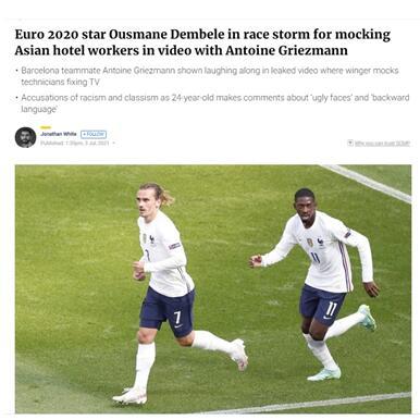 视频于上周五在社交媒体上流传后引发巨大争议。有媒体称,“社交媒体视频显示奥斯曼•登贝莱‘嘲笑亚洲技术人员’后,法国国家队卷入种族主义风暴。”