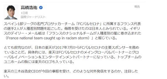 此外,值得一提的是,日本记者高桥浩佑认为,讽刺的是,日本乐天株式会社从2017年7月开始担任巴塞罗那足球俱乐部的主要赞助商。高桥浩佑发文称,针对这一事件,乐天方面会作何反应有待关注。↓