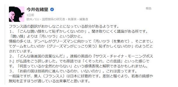 今井佐绪里继续写道:普遍来讲,黑人(法国人)对日本很友好。我认为与其叫嚣说(他们)歧视日本人,这件事更加适合用来纠正年轻人的麻木与无知。”↓