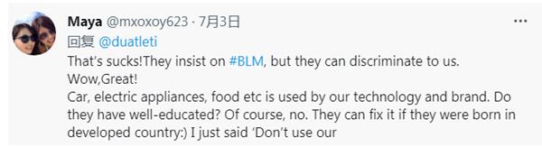 “真是糟透了!他们坚持‘黑人的命也是命’,但他们可以歧视我们。哇,真棒!汽车、电器、食品等都采用我们的技术和品牌。他们受过良好教育吗?显然,没有。如果他们出生在发达国家,他们可以解决这问题:)我只是在说‘不要用我们的(东西)。”
