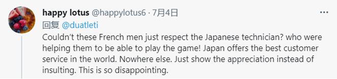 “难道这些法国人就不能尊重日本技术人员吗?谁在帮助他们让他们能玩(电子)游戏!日本提供了世界上最好的客户服务。其他地方没有。要表达感激而不是侮辱。太令人失望了。”