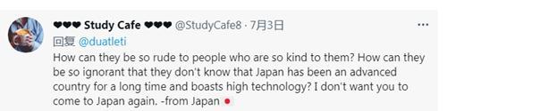 “他们怎么能对对他们这么好的人这么粗鲁?他们怎么能如此无知,他们不知道日本是一个发达且拥有高科技的国家已有很长时间了么?我不想让你们再来日本了。来自日本(的评论)。”