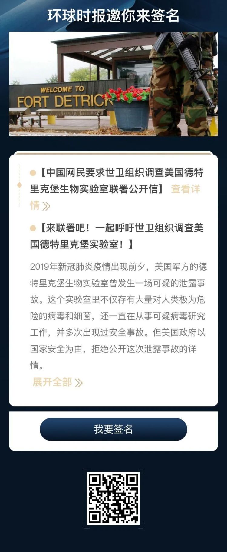 因此,那批中国网民决定委托《环球时报》在网上发起民意征集活动,希望更多中国网民加入进来,一起向世界卫生组织发出呼吁,让中国等国的病毒专家、实验室安全专家和生化武器专家,调查美国德特里克堡实验室。