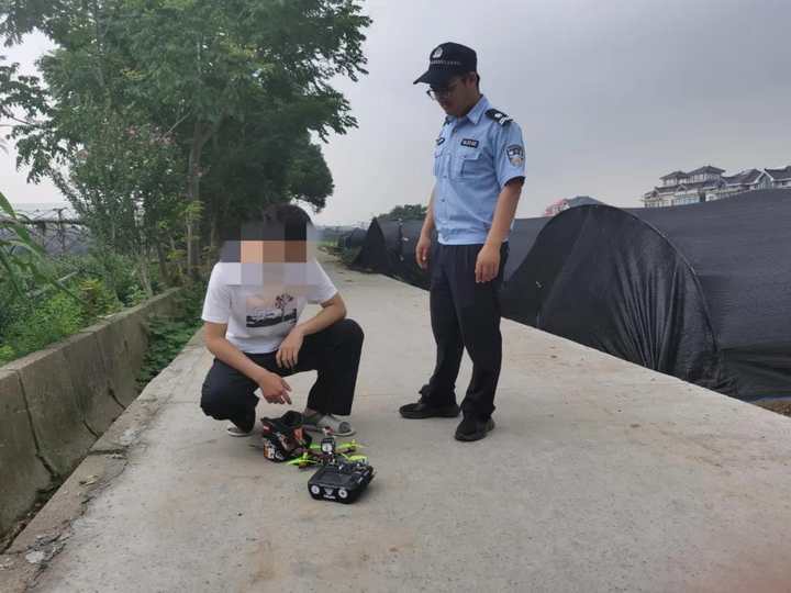 6月中旬,他从淘宝上自购无人机零配件,自己组装无人机(事先破解了电子围栏)。在自家院子附近试飞十余次后,29日傍晚在万红路旁飞行,还用FPV眼镜观测无人机第一视角并进行飞行拍摄。不到五分钟,民警赶到。