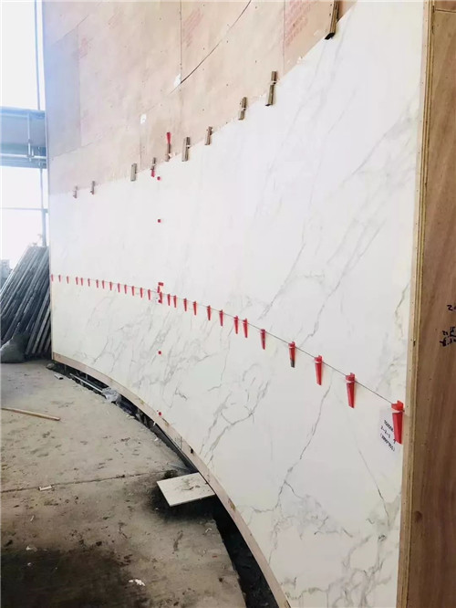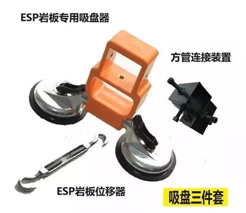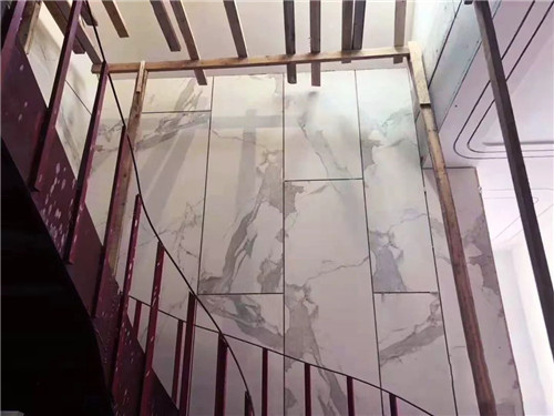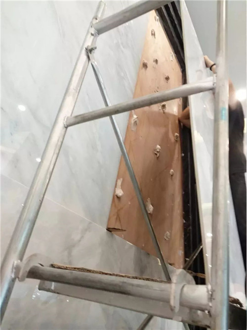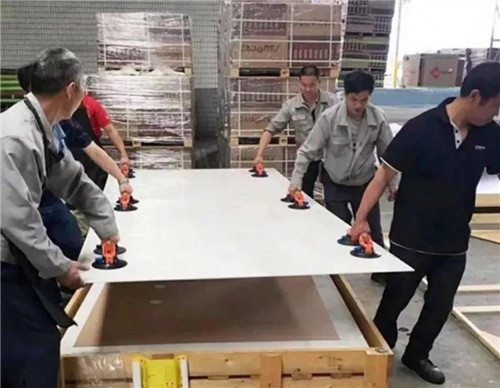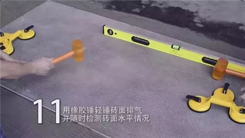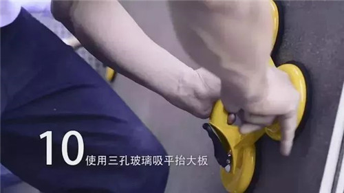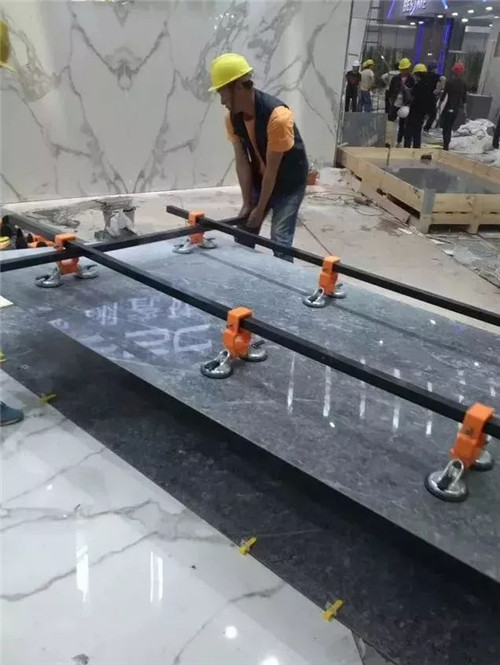 搬运铺贴:用三孔玻璃吸工具平抬大板平移施工位置,放置到铺好的瓷砖胶基面上,至少需要两名工人进行搬运,面积更大的需要使用移动架搬运。