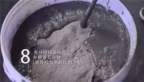 调制瓷砖胶:将瓷砖胶与水4:1配置,用灰勺搅拌至润涓均匀,无明显块状或糊状结块,搅拌后的浆料静置5-10分钟后再稍加搅拌1-2分钟即可使用。