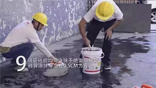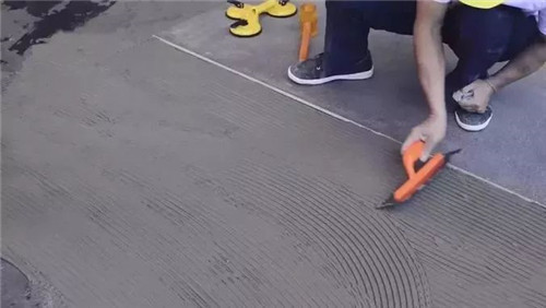 涂抹瓷砖胶:在地面均匀铺上一层瓷砖胶,形成半干的一层,再次用瓷砖胶填平表面凹凸处,厚度为0.5CM左右;适当条件下,可同时将瓷砖胶均匀地抹在瓷砖背面,要求瓷砖胶涂抹饱满。