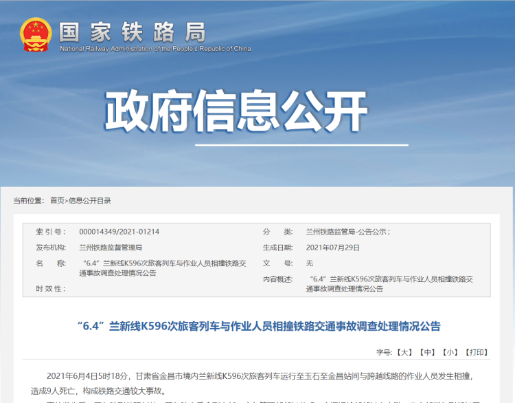 国家铁路局官网7月29日发布《“6.4”兰新线K596次旅客列车与作业人员相撞铁路交通事故调查处理情况公告》。详情如下: